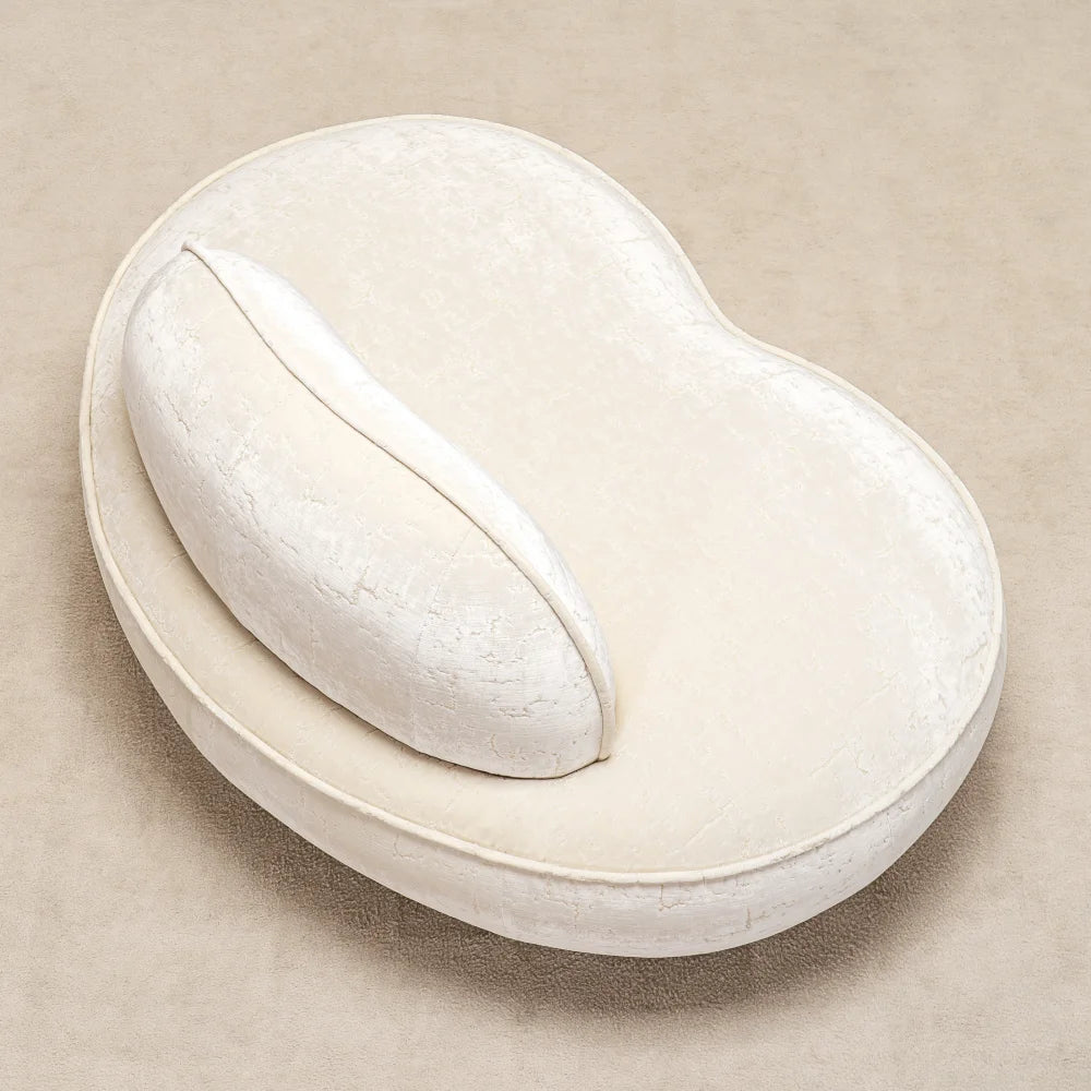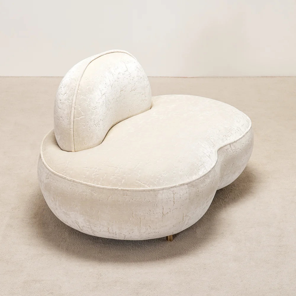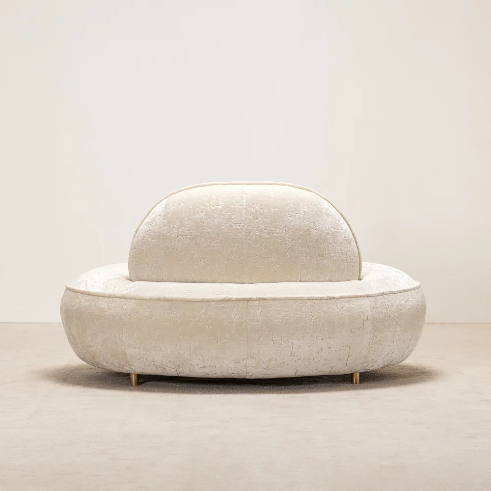 Jane Lounge Chair sits low and enveloping, shaped by soft, continuous volumes. Embroidered fabric traces its curves, while discreet brass details add restraint and precision. A comfort-first seat that reads as a sculptural presence.