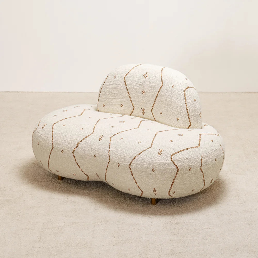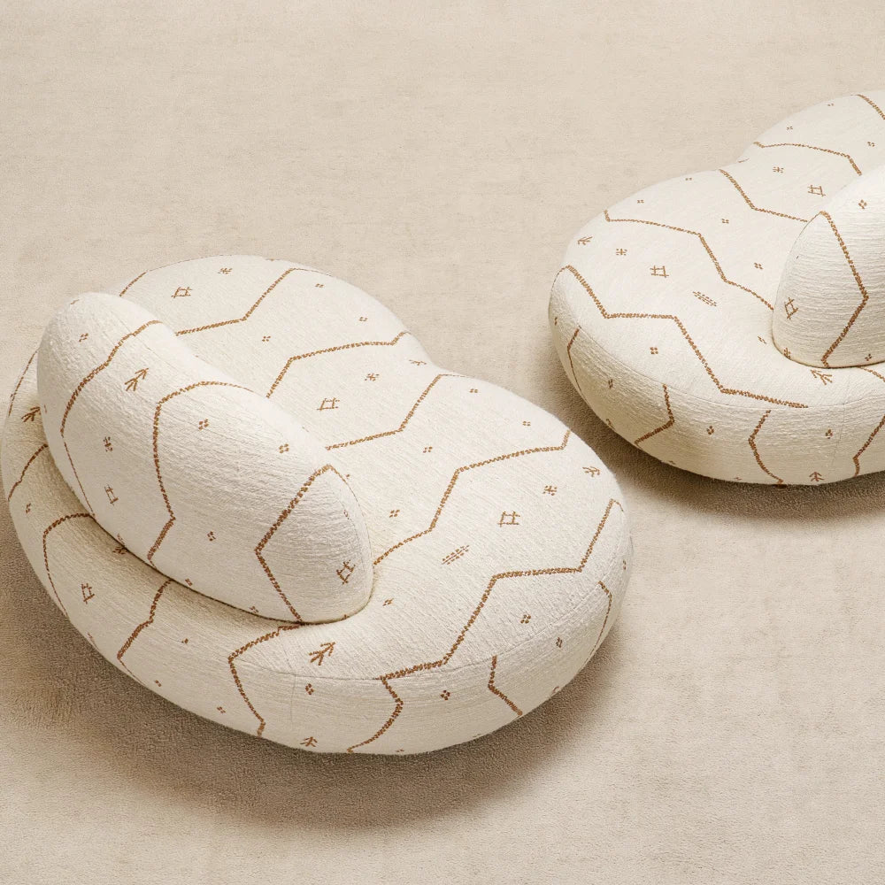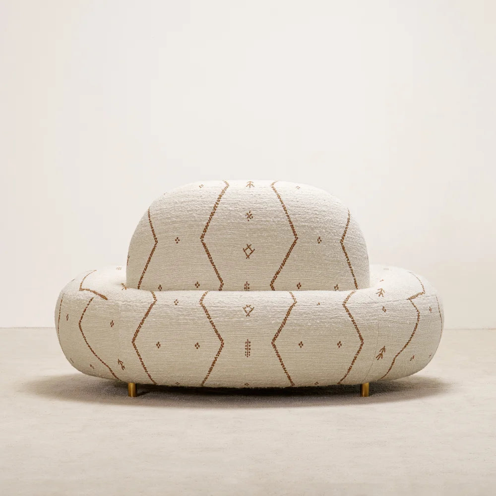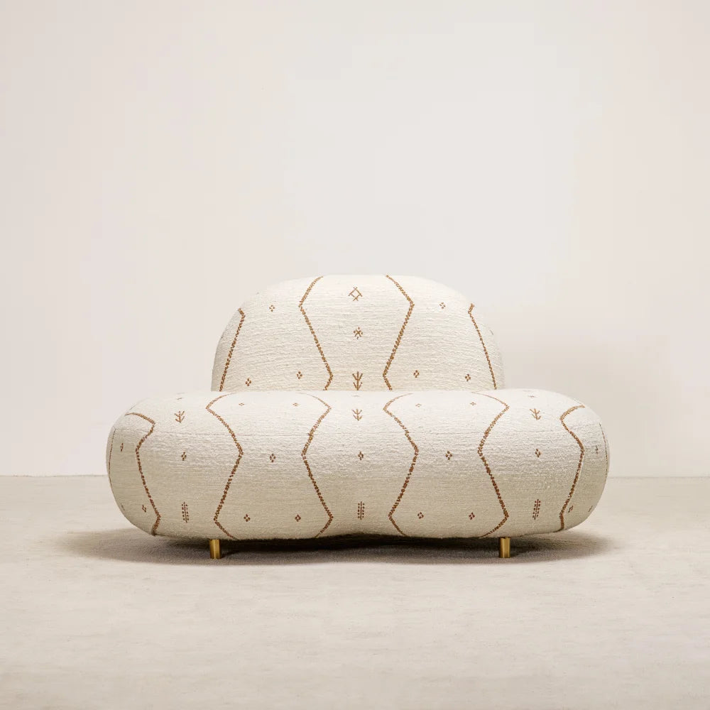 Jane Lounge Chair sits low and enveloping, shaped by soft, continuous volumes. Embroidered fabric traces its curves, while discreet brass details add restraint and precision. A comfort-first seat that reads as a sculptural presence.