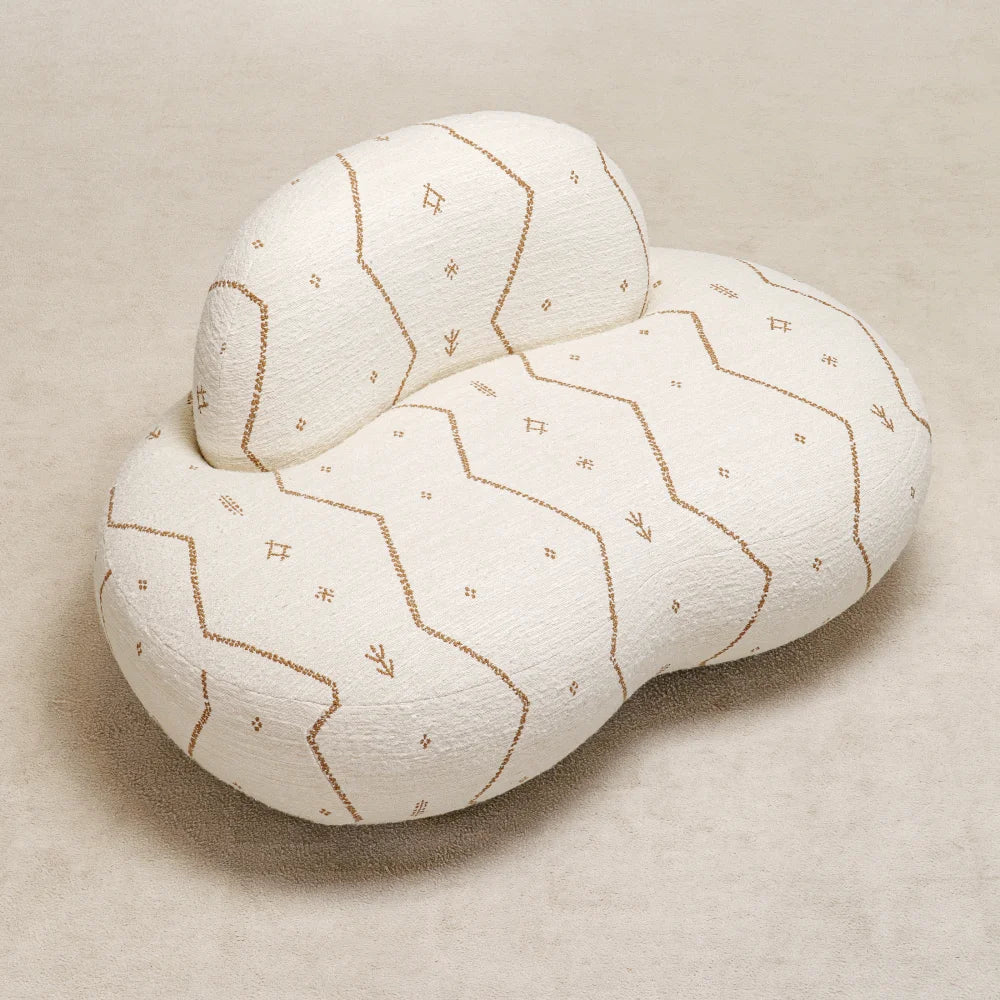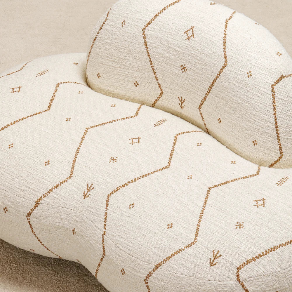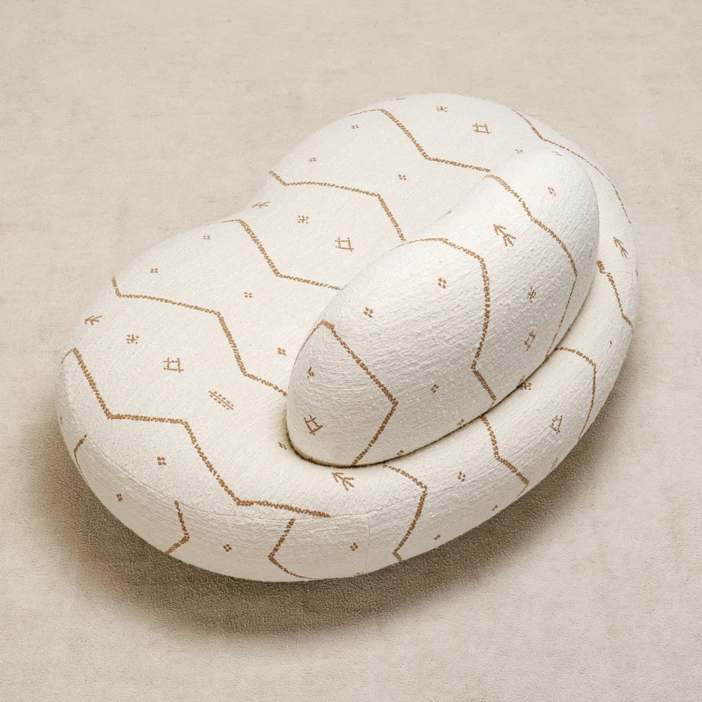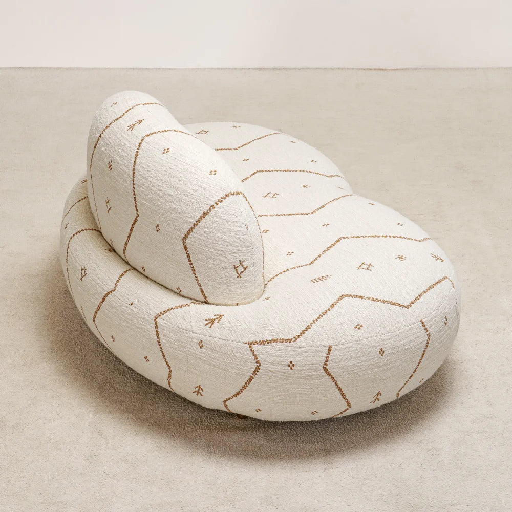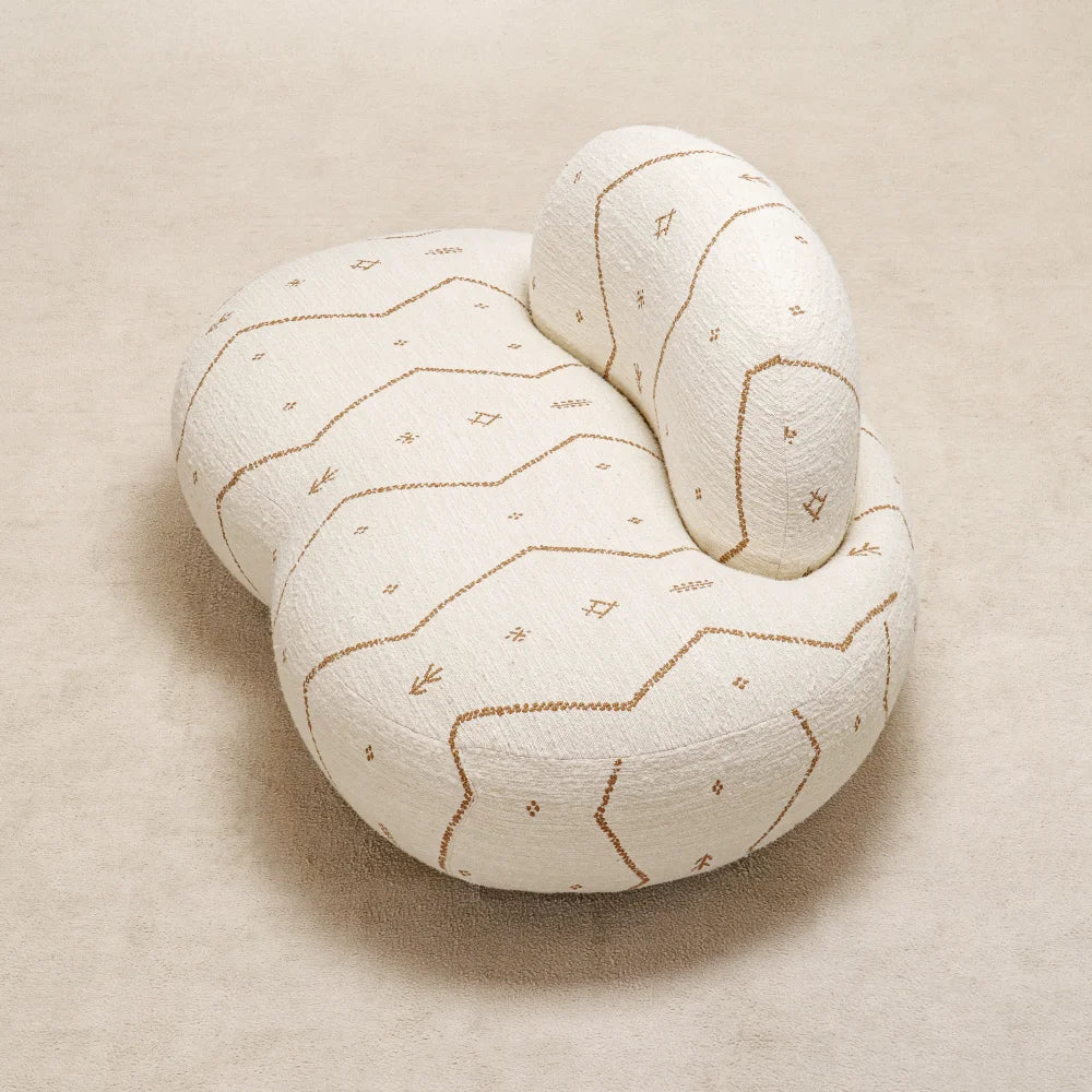 Jane Lounge Chair sits low and enveloping, shaped by soft, continuous volumes. Embroidered fabric traces its curves, while discreet brass details add restraint and precision. A comfort-first seat that reads as a sculptural presence.