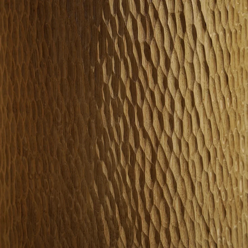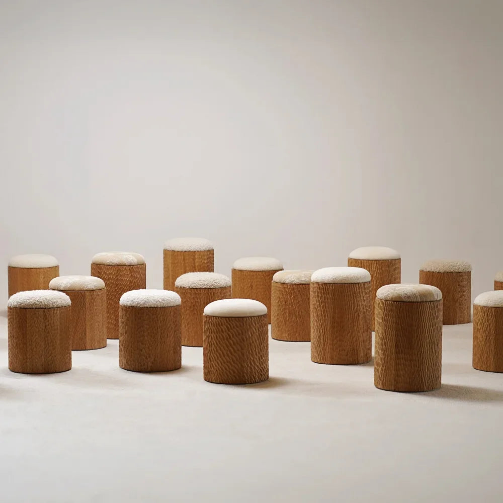 Jessie is a compact stool carved from solid oak. Its cylindrical form highlights the wood grain, while an upholstered seat brings tactile softness and quiet contrast, balancing function with a collectible presence.