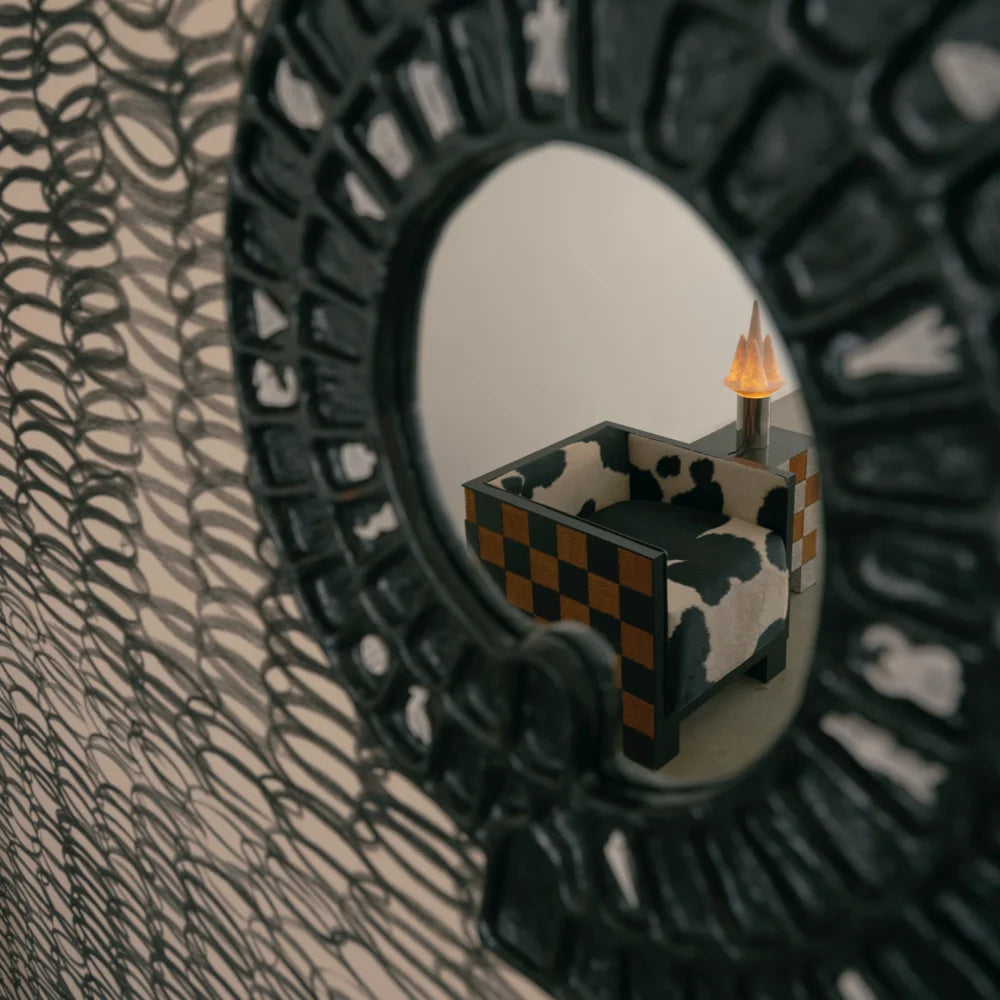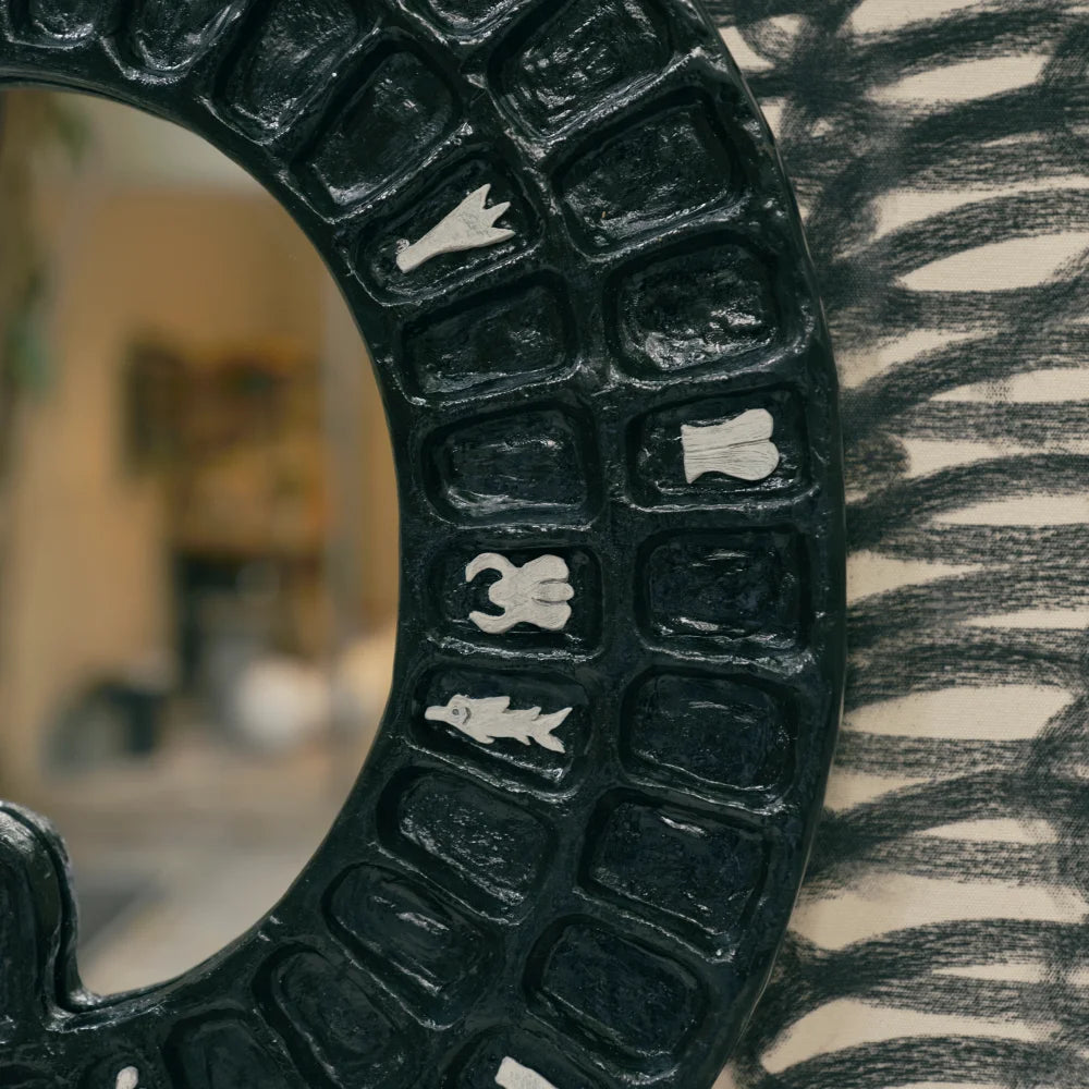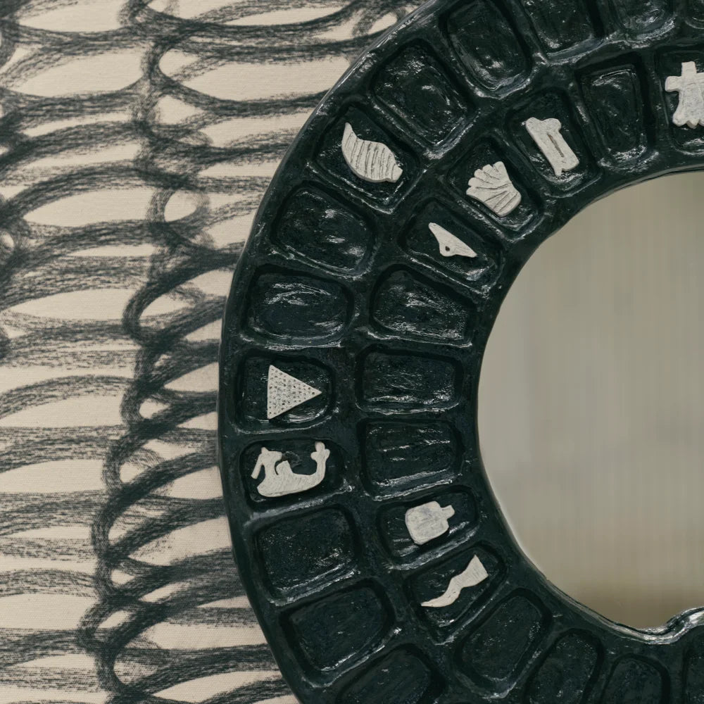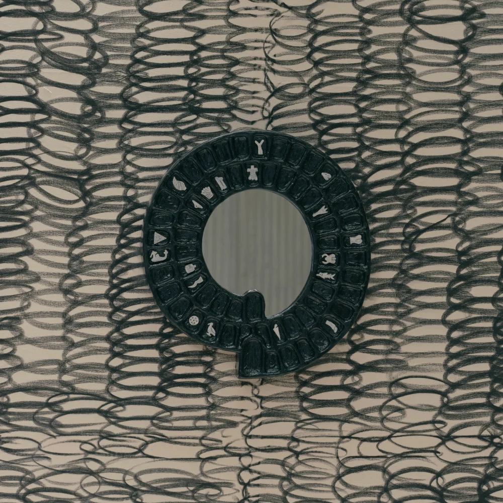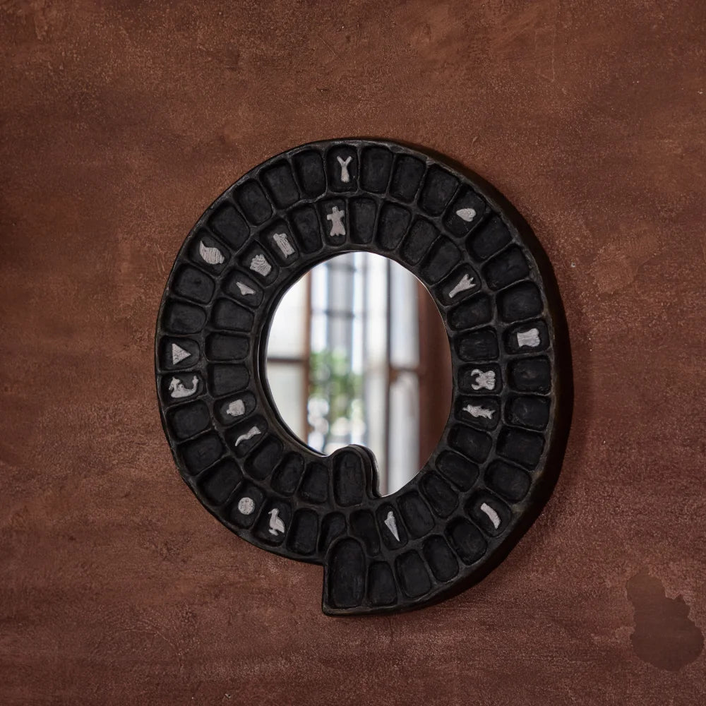 A sculptural wall mirror crafted from hand-patinated cast brass with a central mirrored surface. Its symbolic, rhythmic form transforms a functional object into a graphic piece, positioned between wall art and collectible design.