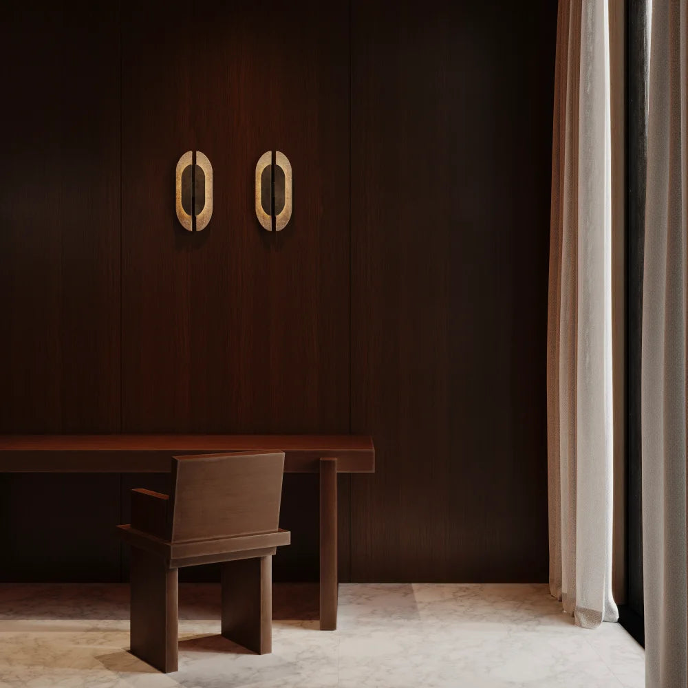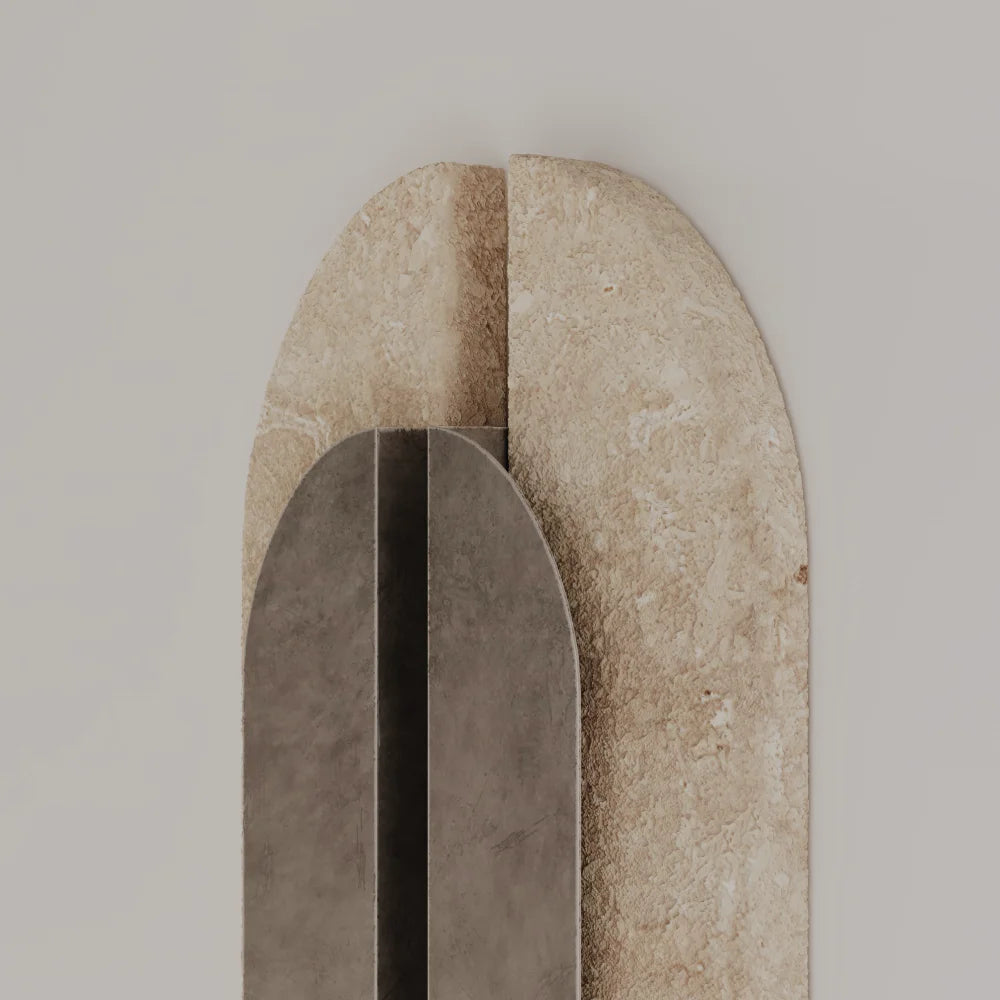 Arcades is presented as a wall lamp, a mineral form fixed to the surface, where light slides along the material rather than illuminating it directly. Relief and depth shape a discreet, architectural presence.