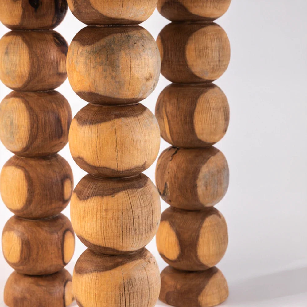 The Latte Table features a sculptural round form, combining a travertine top with a base of turned wooden volumes. The dialogue between mineral stone and solid wood highlights a balanced expression of mat