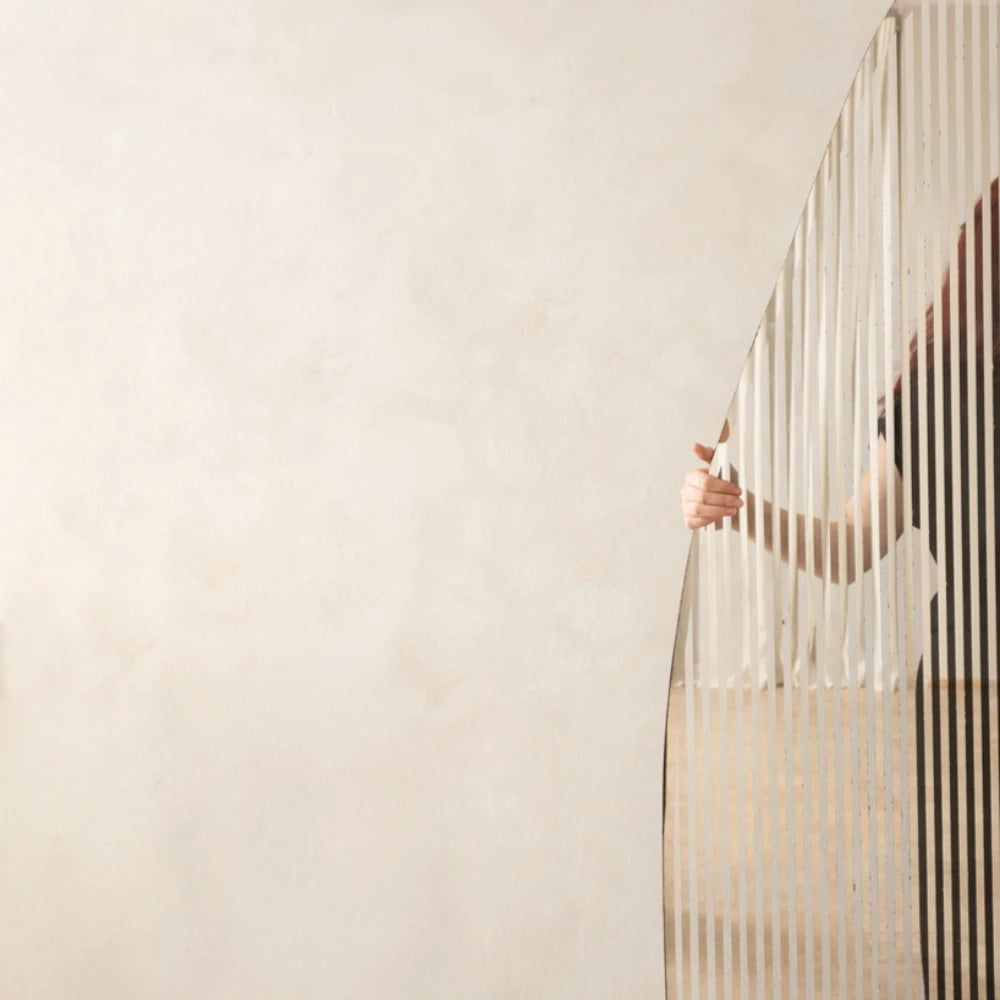 A silver mirror defined by a vertical rhythm of opaque, transparent, and reflective lines across a curved form. The layered striping shifts perception, moving fluidly between surface and volume as light and reflection change.