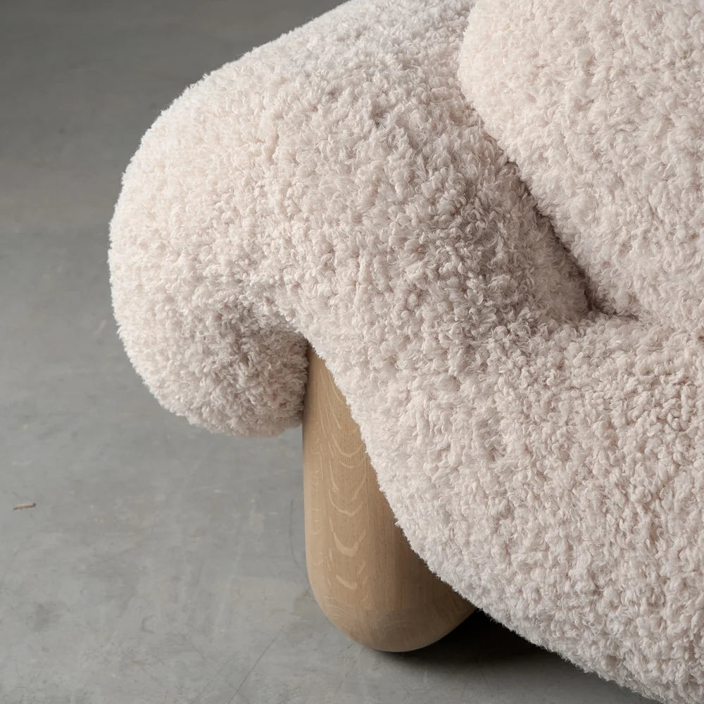 A lounge chair defined by generous, enveloping volumes, conceived as a low, protective seat. Faux fur accentuates its continuous curves, while solid oak legs ground the piece, offering a sense of deep, deliberate comfort.