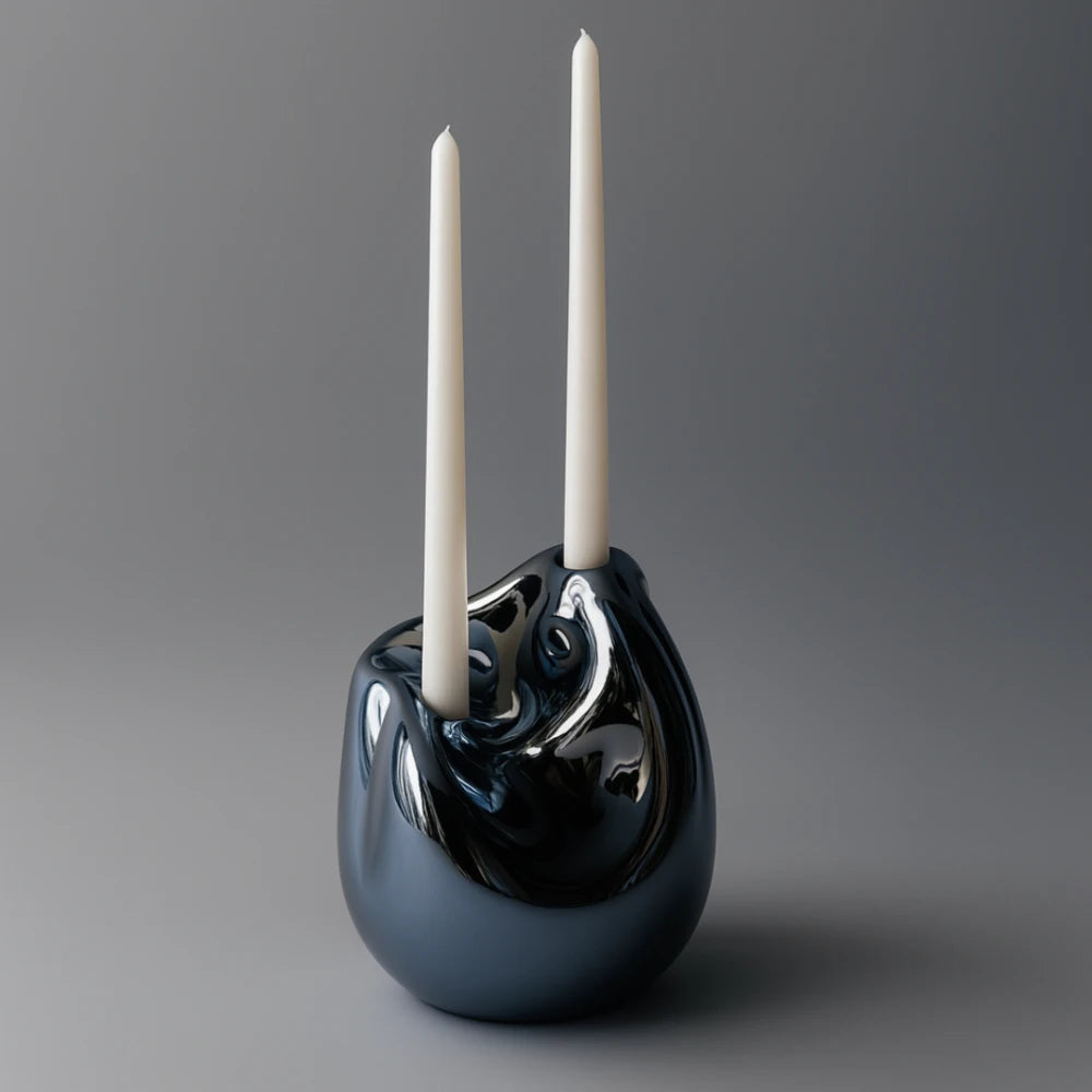A blown-glass candle holder shaped by external intervention as the molten material cools. Its smoke mirror surface captures the flame’s glow, letting light dance across compact curves and fluid tensions.
