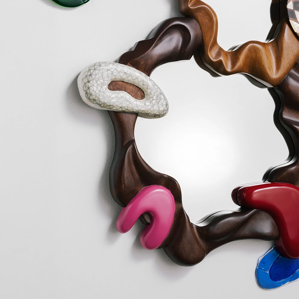 This mirror brings together multiple reflective surfaces framed by a sculpted, sinuous structure. Organic volumes and applied elements animate the outline, giving the piece a dynamic and fragmented reading of form.