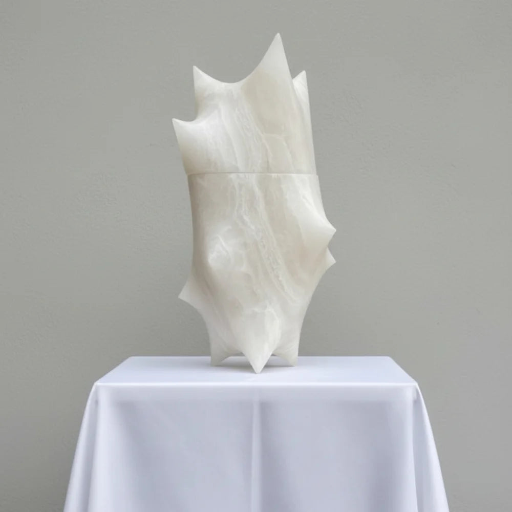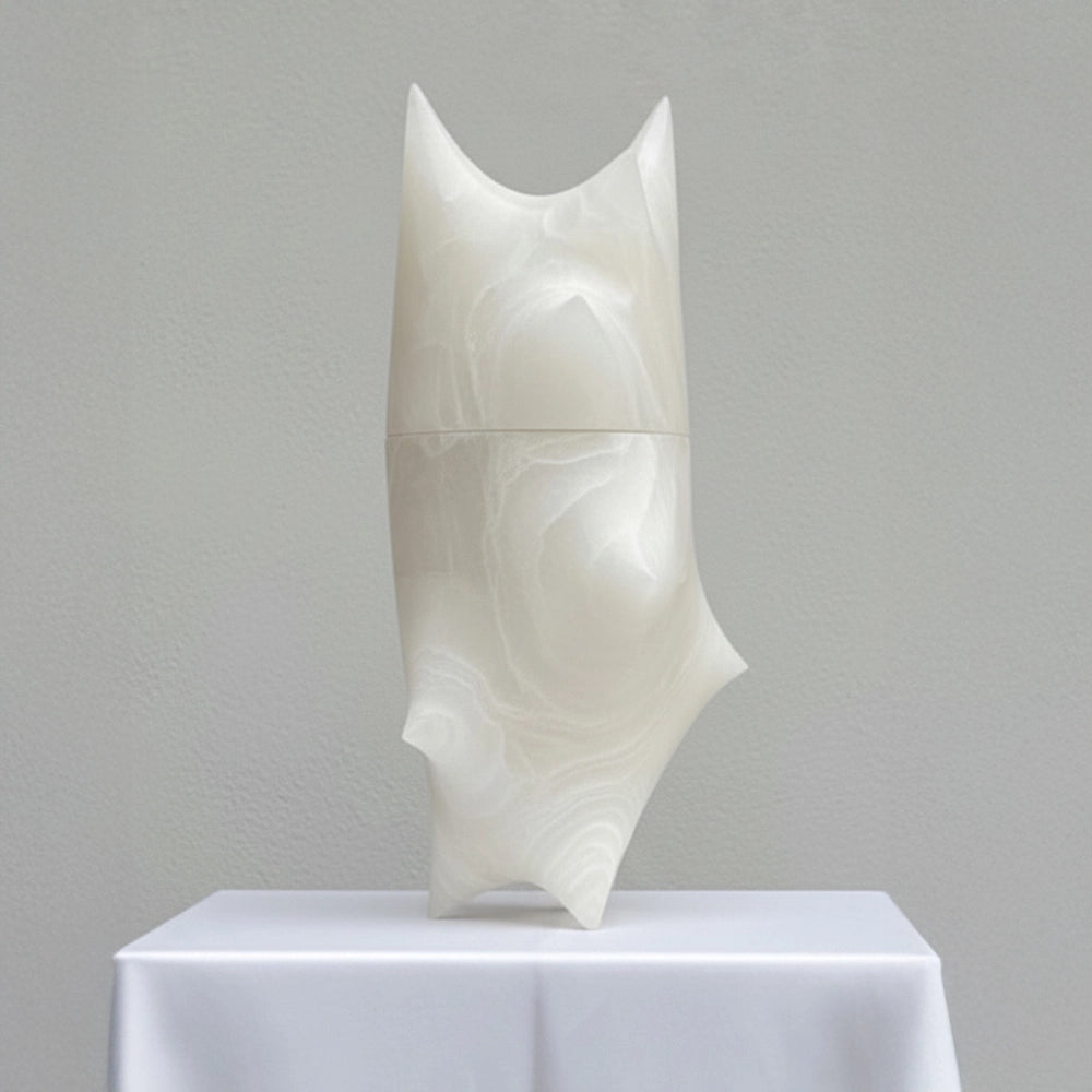 This sculptural object explores transformation through assembly. Two mineral forms interlock in a precise gesture, revealing an organic, almost ritual presence, where pale matter engages with time, the hand, and a quiet sense of becoming.