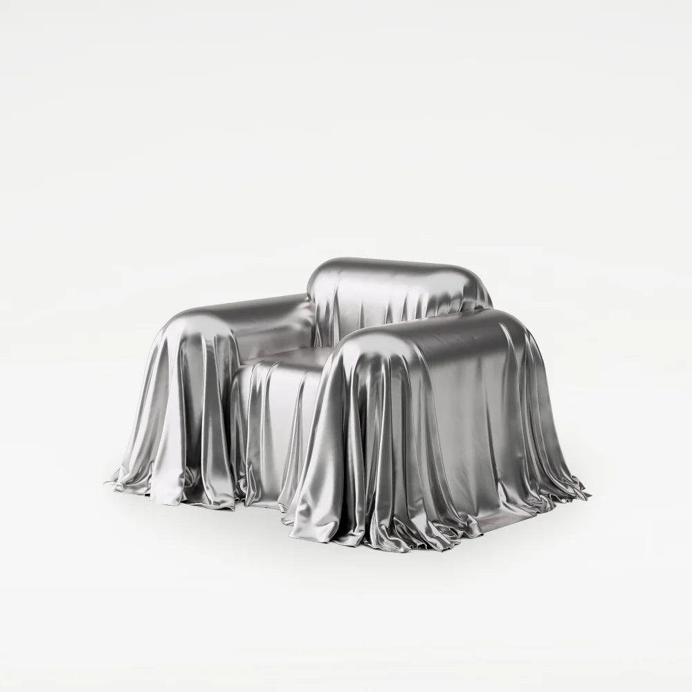 A sculptural armchair draped in a metallic-look textile, evoking fabric frozen in motion. The form dissolves beneath the folds, allowing material to become volume, creating a piece with a distinctly expressive, almost theatrical presence.