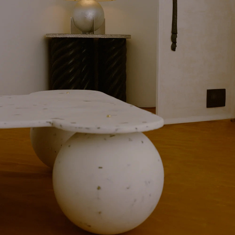 A sculptural occasional table featuring granulated fibreglass legs and an egg-shell lacquered top. Twisted volumes and contrasting surfaces create a tactile, graphic presence with a strong sculptural identity.