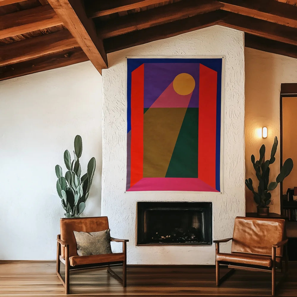 Vertical composition structured by a yellow circle and a luminous diagonal projection, framed by green, blue, pink, violet, and red color fields in a symmetrical construction. Acrylic on textile, each work carries its singularity and unfolds a strong visual presence within a space.