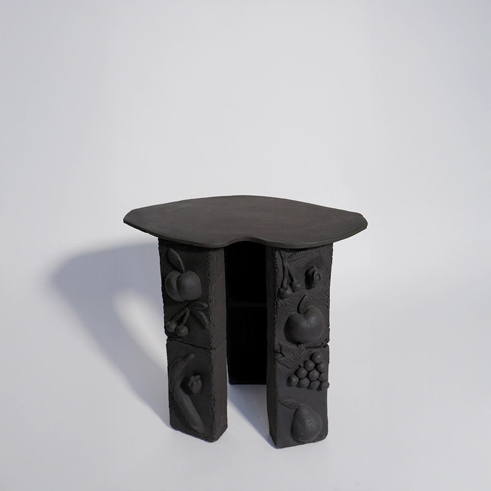 This ceramic table rests on two relief-sculpted legs supporting an irregular tabletop. Figurative motifs across the vertical volumes define the structure and give the piece its distinctive character.