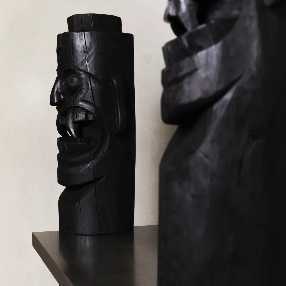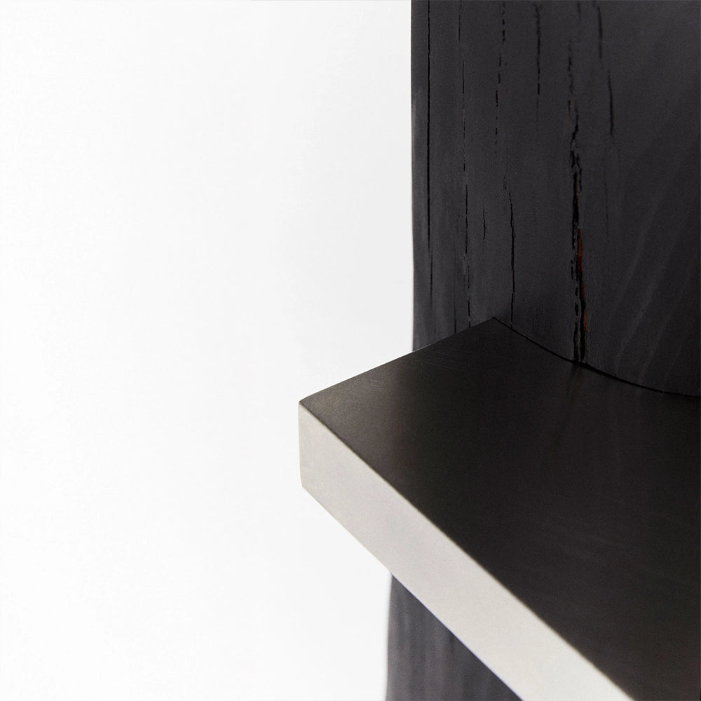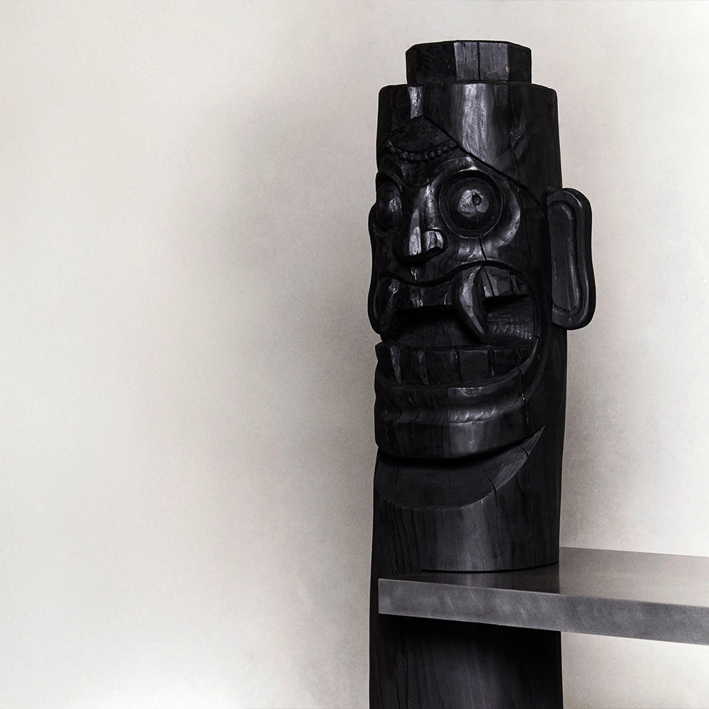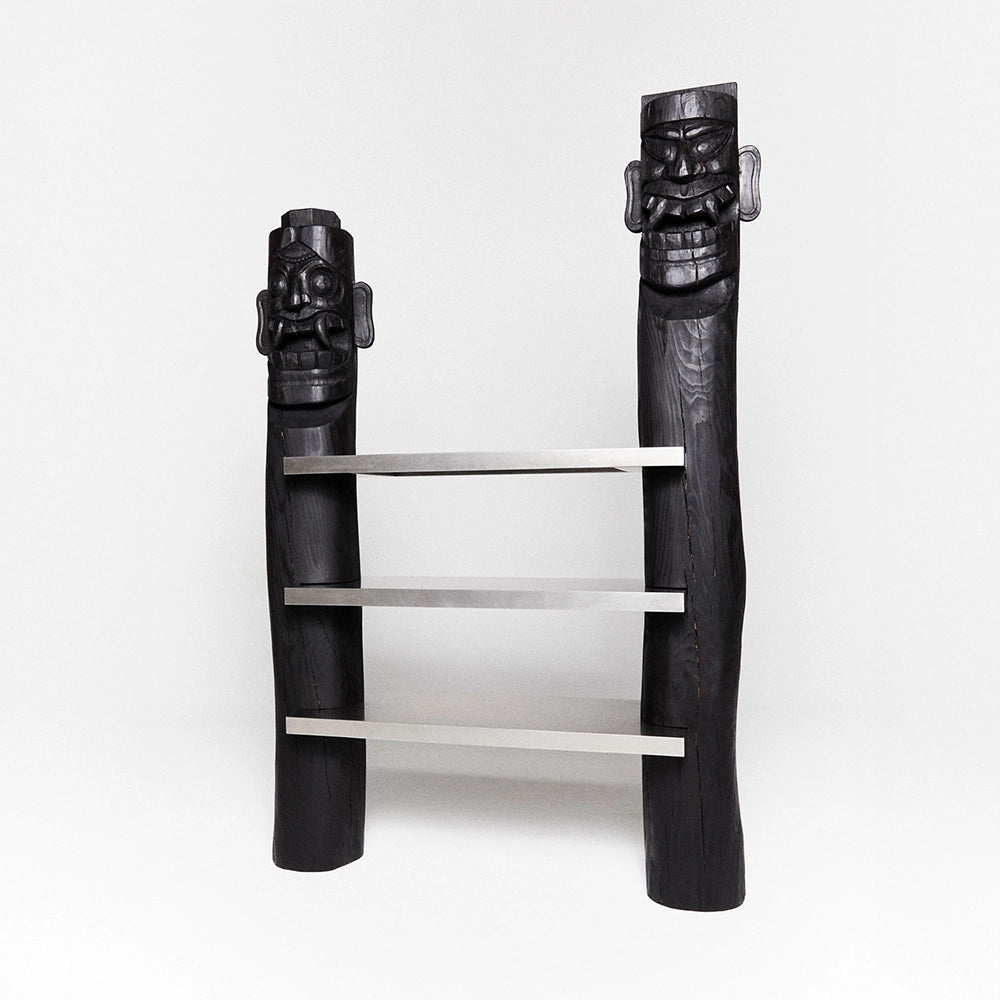 Narrative002 combines carved red pine uprights with stainless steel shelves. The sculpted wooden figures frame the structure, creating a strong frontal presence that balances functional storage with sculptural expression.