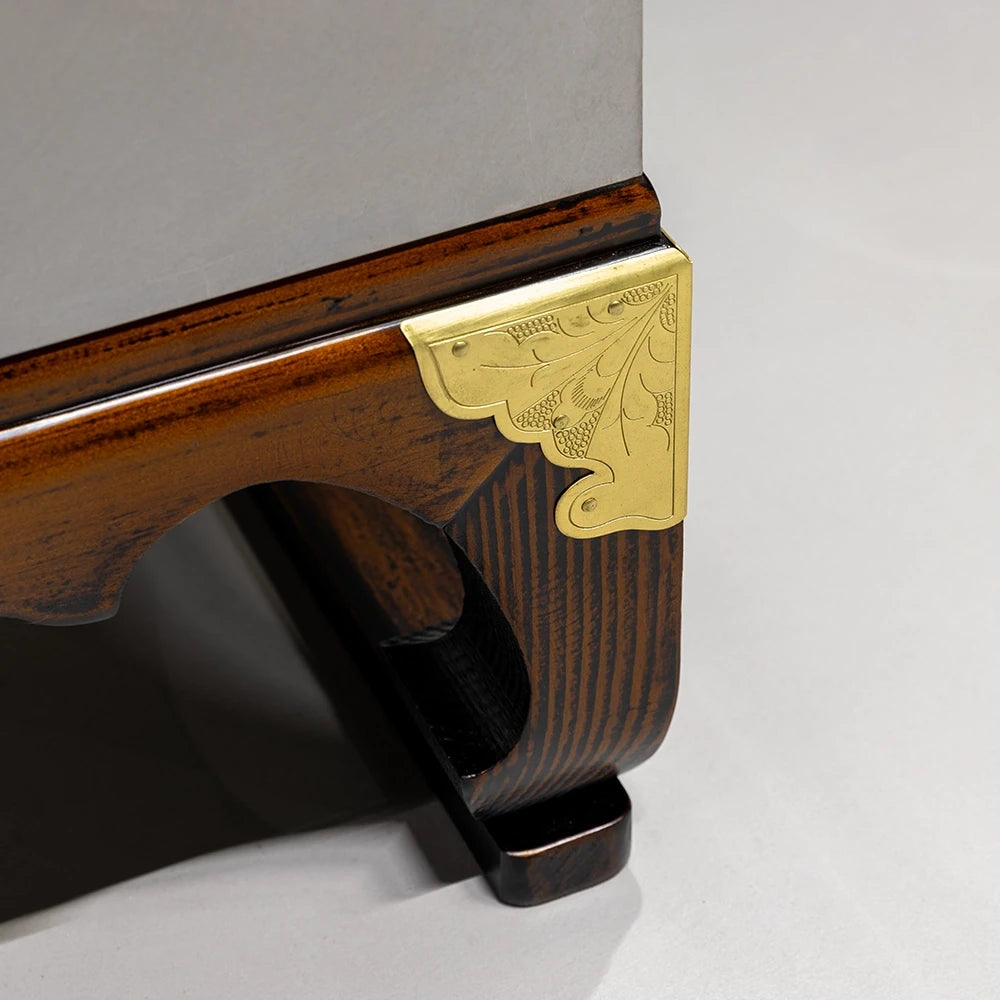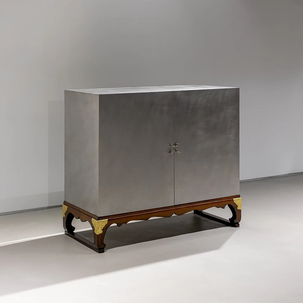 Narrative 005 combines a stainless steel structure with an antique wooden base. The contrast between industrial surfaces and ornamental craftsmanship creates a dialogue between heritage, function, and contemporary presence.