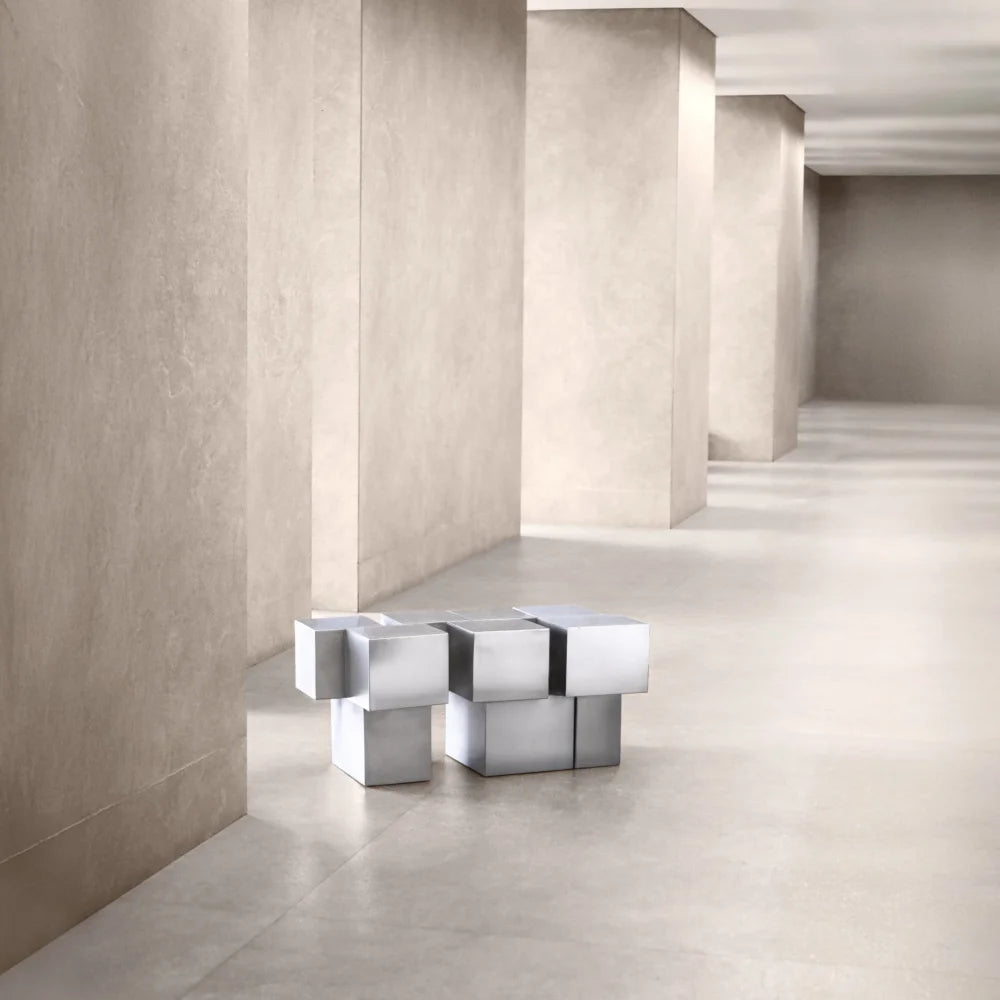 Sculptural bench composed of brushed stainless steel modules. A fragmented, rhythmic structure playing with repetition, balance, and industrial precision, navigating between solid volumes and architectural voids.