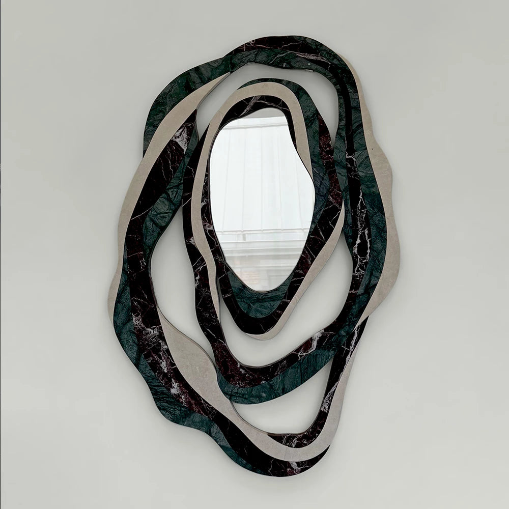 A mirror framed by layered, irregular mineral contours. Undulating lines create a strong sense of depth, while the interplay of stone and reflective surface balances material presence, reflection, and movement.