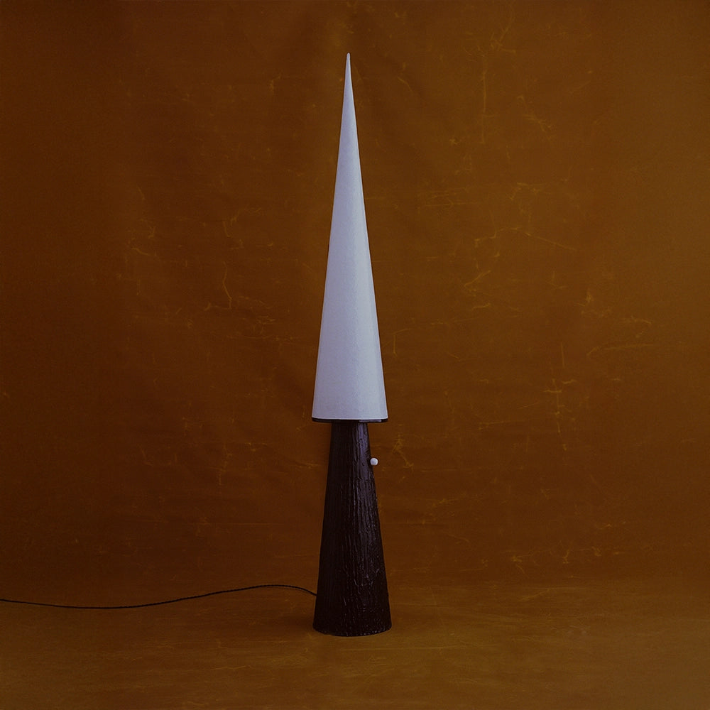 A sculptural floor lamp featuring a hand-textured base and a translucent fibreglass conical shade. Its elongated, ritual-like silhouette allows light to rise softly, balancing architectural presence with artisanal craftsmanship.