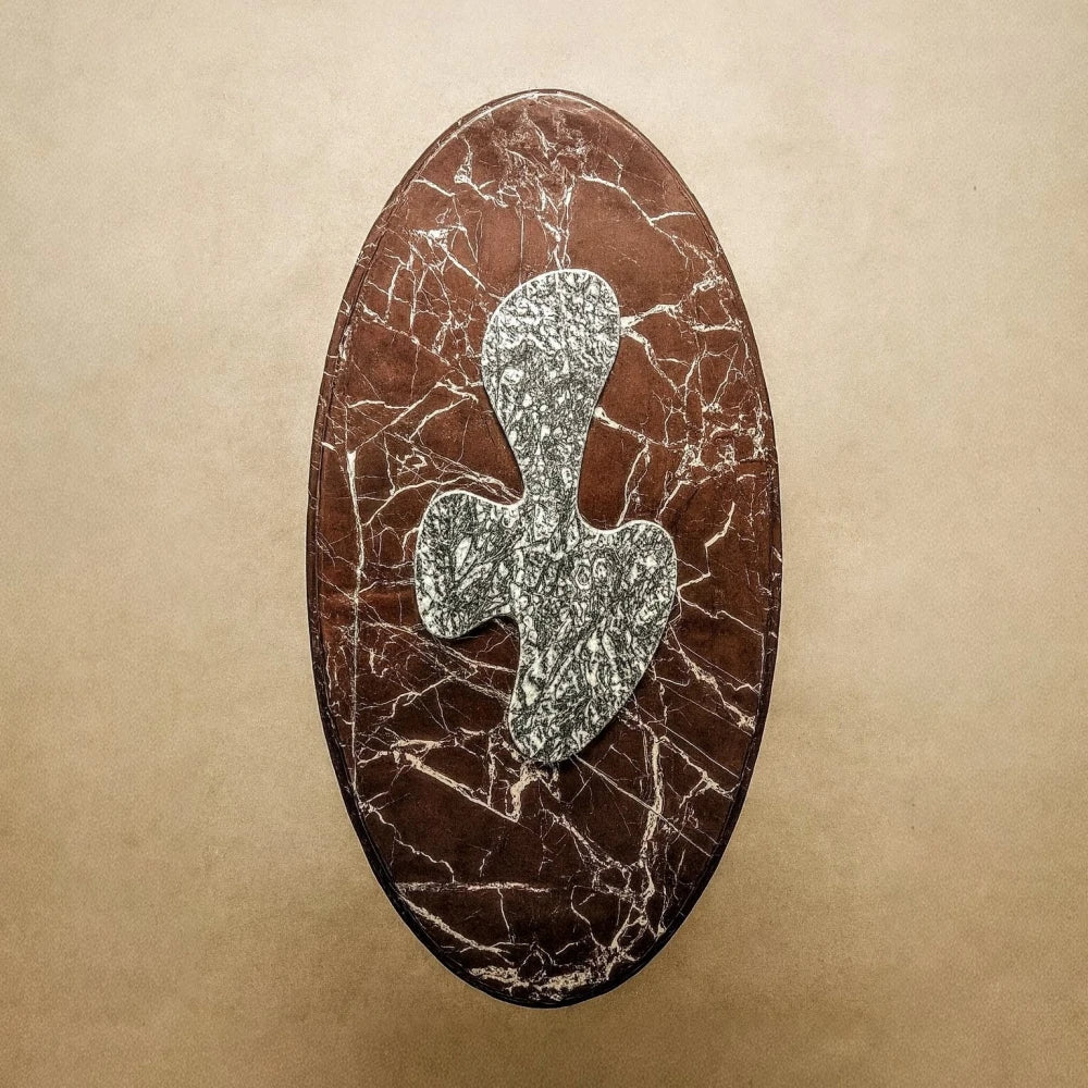 Sculptural coffee table pairing an oval veined marble top with a polished stainless steel base shaped as a form held in tension. Mirror surfaces capture and amplify surrounding light, while the stone asserts a dense, mineral presence with contemporary clarity.