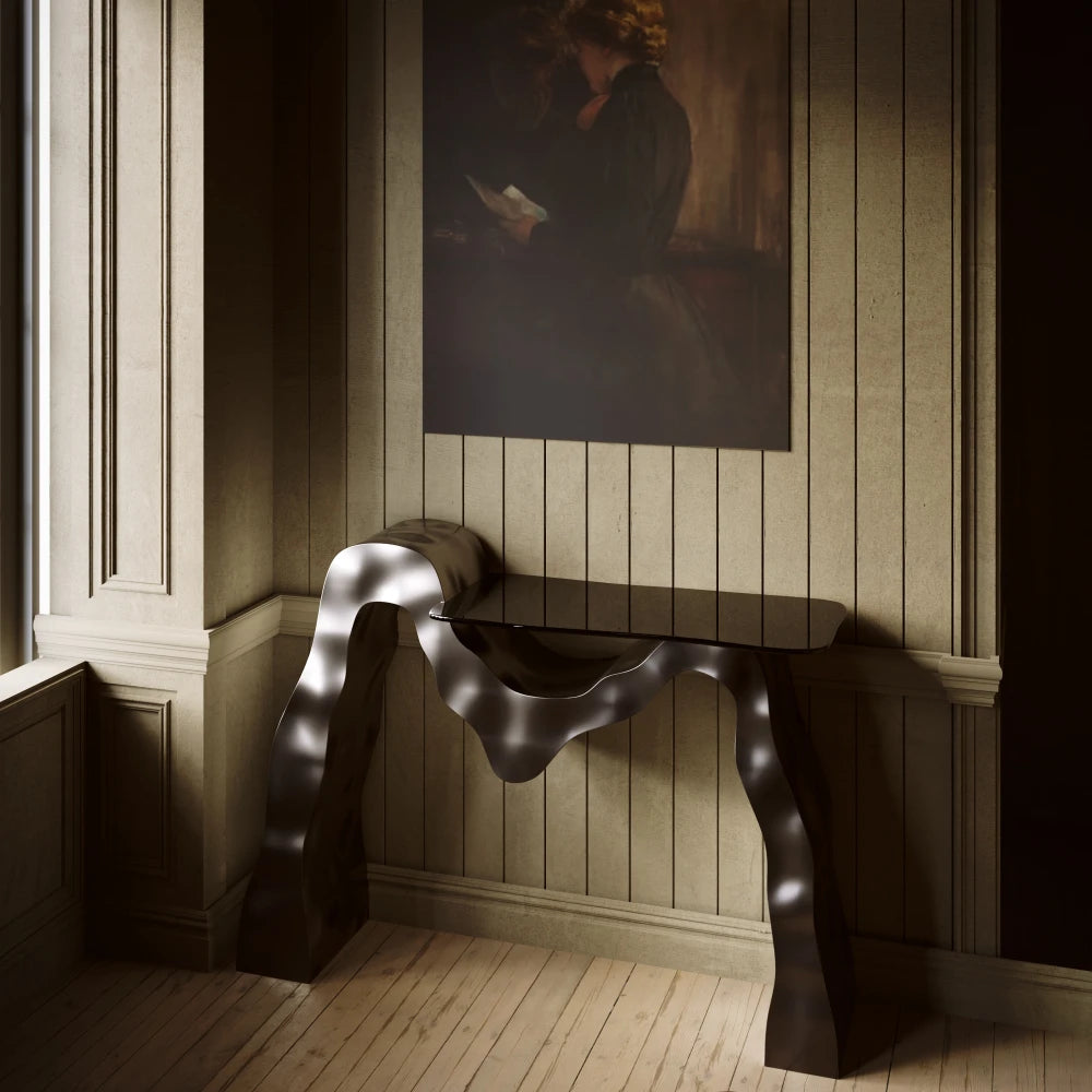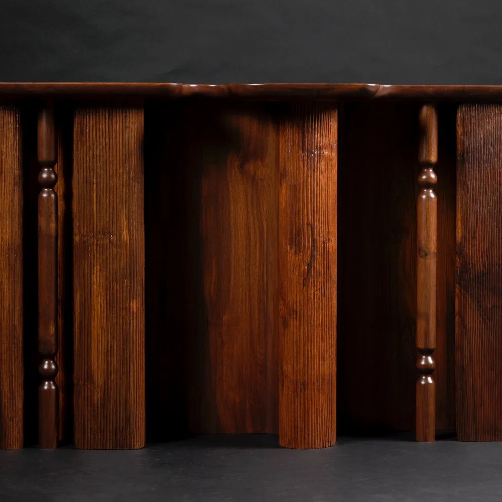 Ridge is a handcrafted console table in reclaimed teak wood, reinterpreting traditional craft through a bold, grounded silhouette. Vertical grooves add rhythm and depth, while slender turned legs bring a refined contrast to the solid structure. An organic, generously sized top completes the piece with a strong and distinctive presence.
