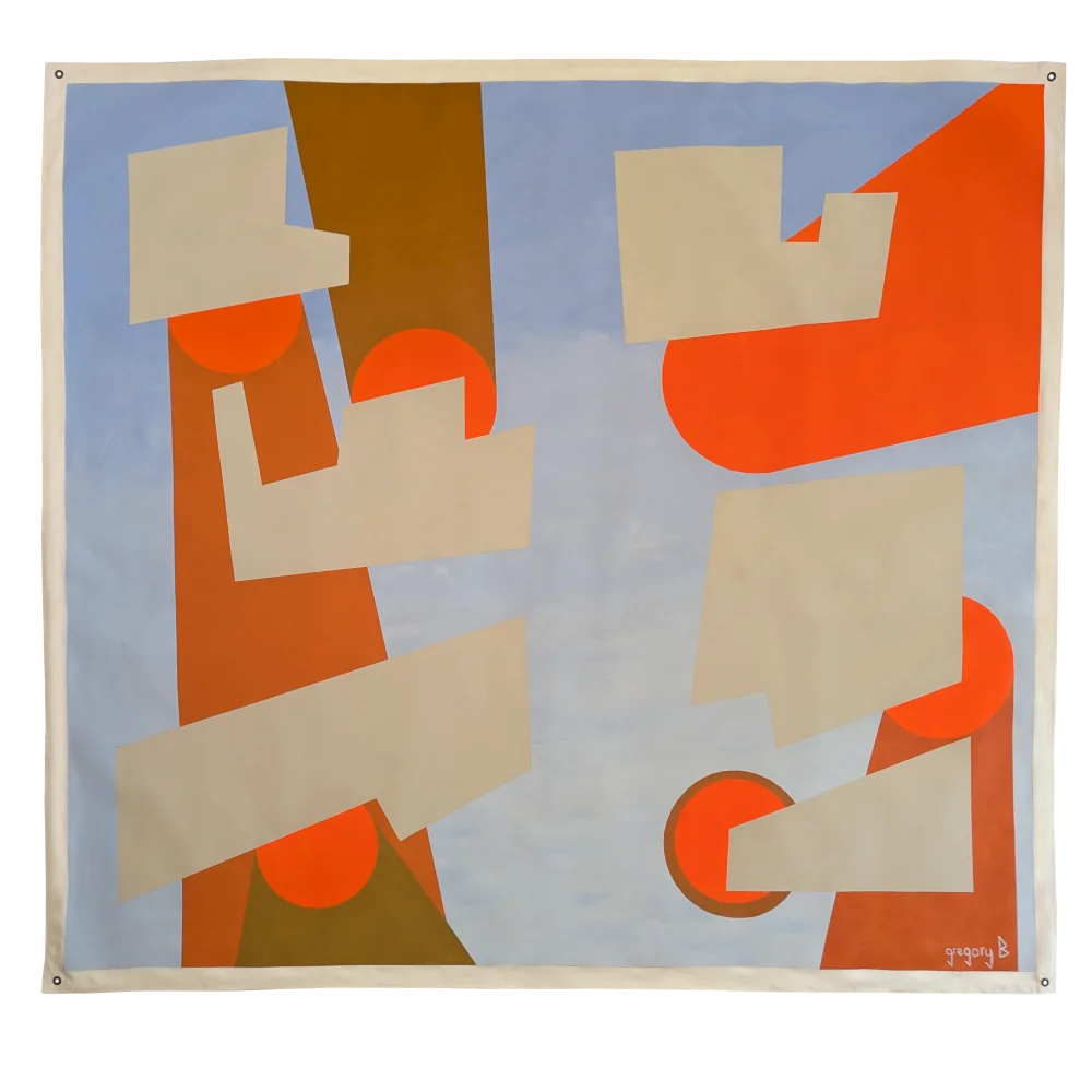 Layered geometric forms on a soft blue ground, punctuated by orange circles and earthy blocks. Acrylic on textile, each work carries its singularity and unfolds a strong visual presence within a space.