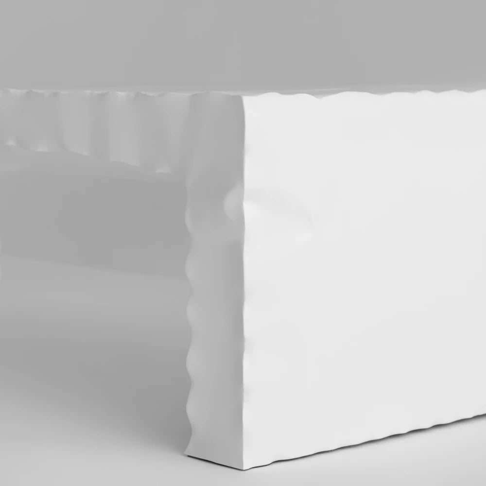 A monolithic metal table defined by solid volumes and a continuous line. Its subtly irregular surface catches the light and reveals gentle variations, preserving a minimal, unforced presence shaped by making, in the spirit of Kameh’s 0.4 collection.