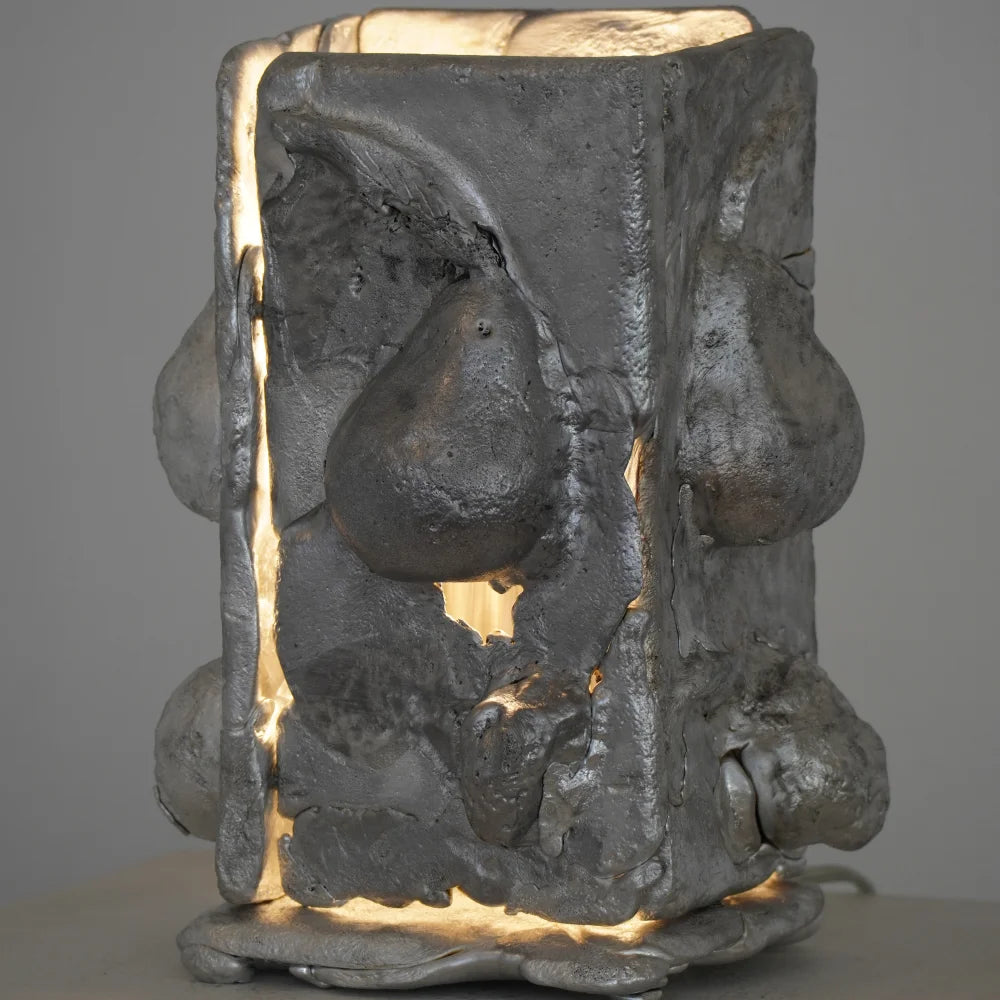 This cast aluminium table lamp reads as a compact volume shaped by figurative reliefs across its faces. Light is integrated into the form, turning the object into a sculpted block as much as a focused point of illumination.