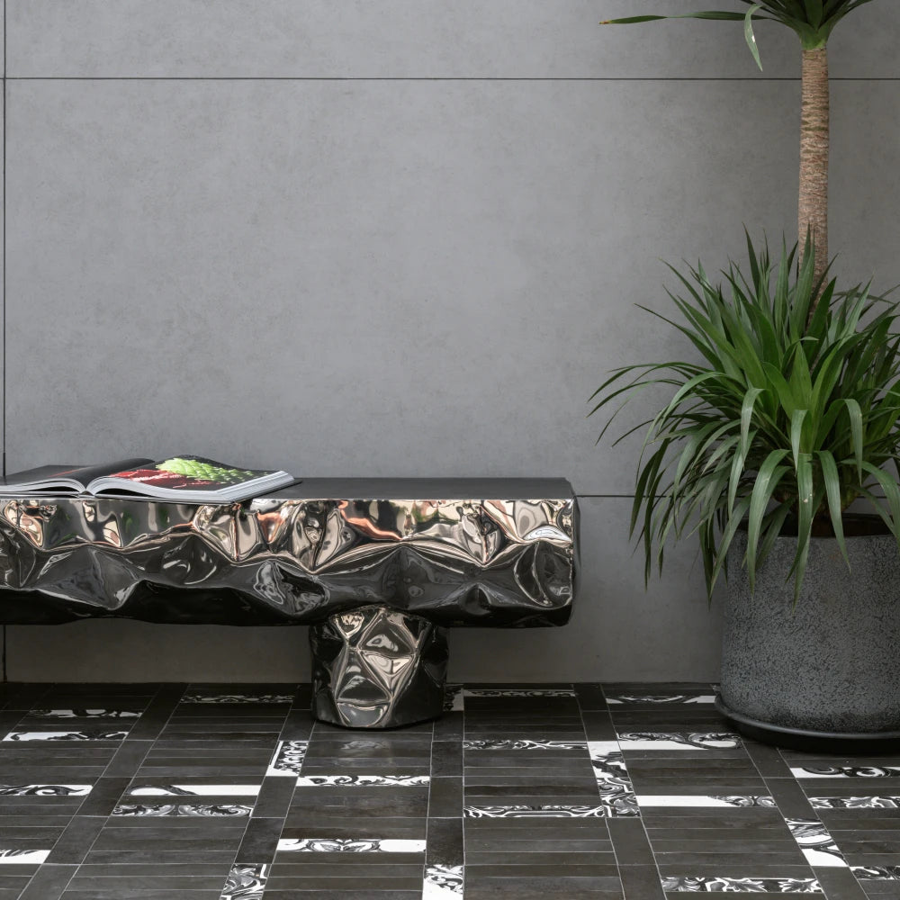 This bench in polished stainless steel unfolds in a long, continuous line, animated by undulations across its mirrored surface. The piece captures its surroundings with intensity, turning every reflection into movement and asserting a striking sculptural presence.