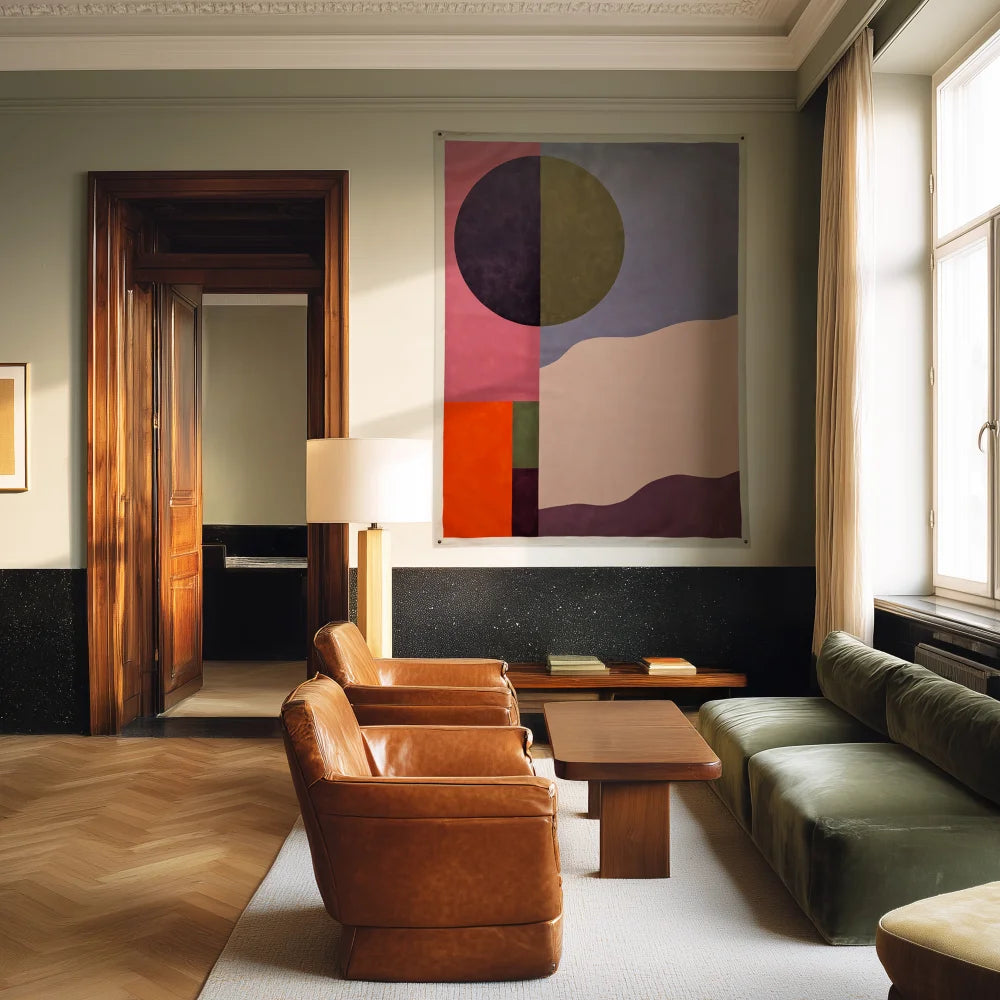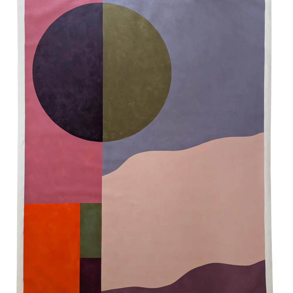 Vertical composition structured around a two-tone circle, combined with rectangular color fields and wavy lines in pink, olive, beige, violet, and orange tones. Acrylic on textile, each work carries its singularity and unfolds a strong visual presence within a space.