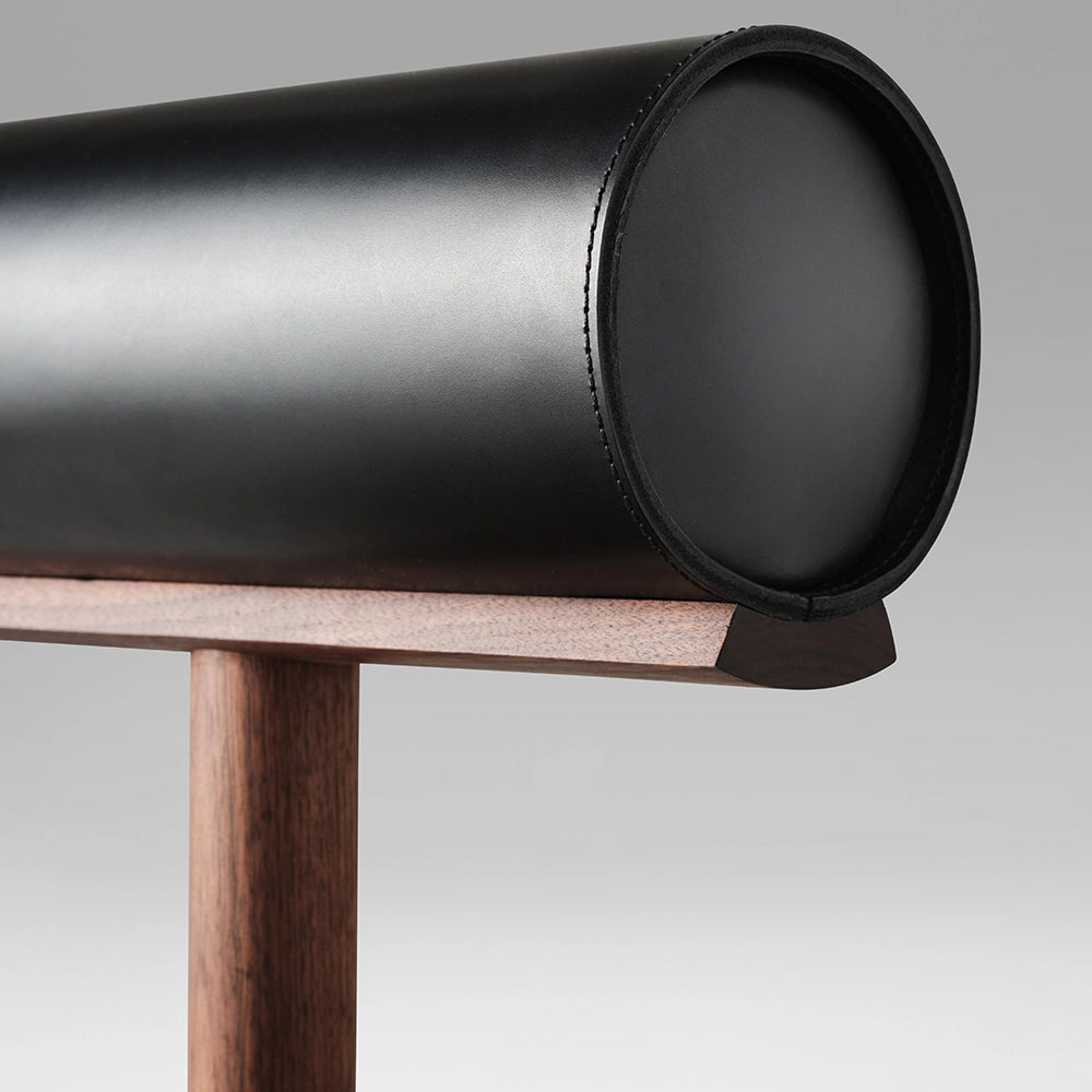 The Una Counter Stool adapts the Una chair’s language to a taller profile. Curved wooden elements support a leather-upholstered cylindrical backrest, balancing comfort and structure through a clear, restrained geometry.