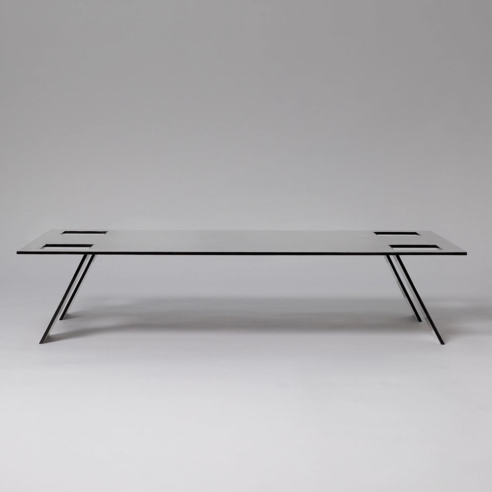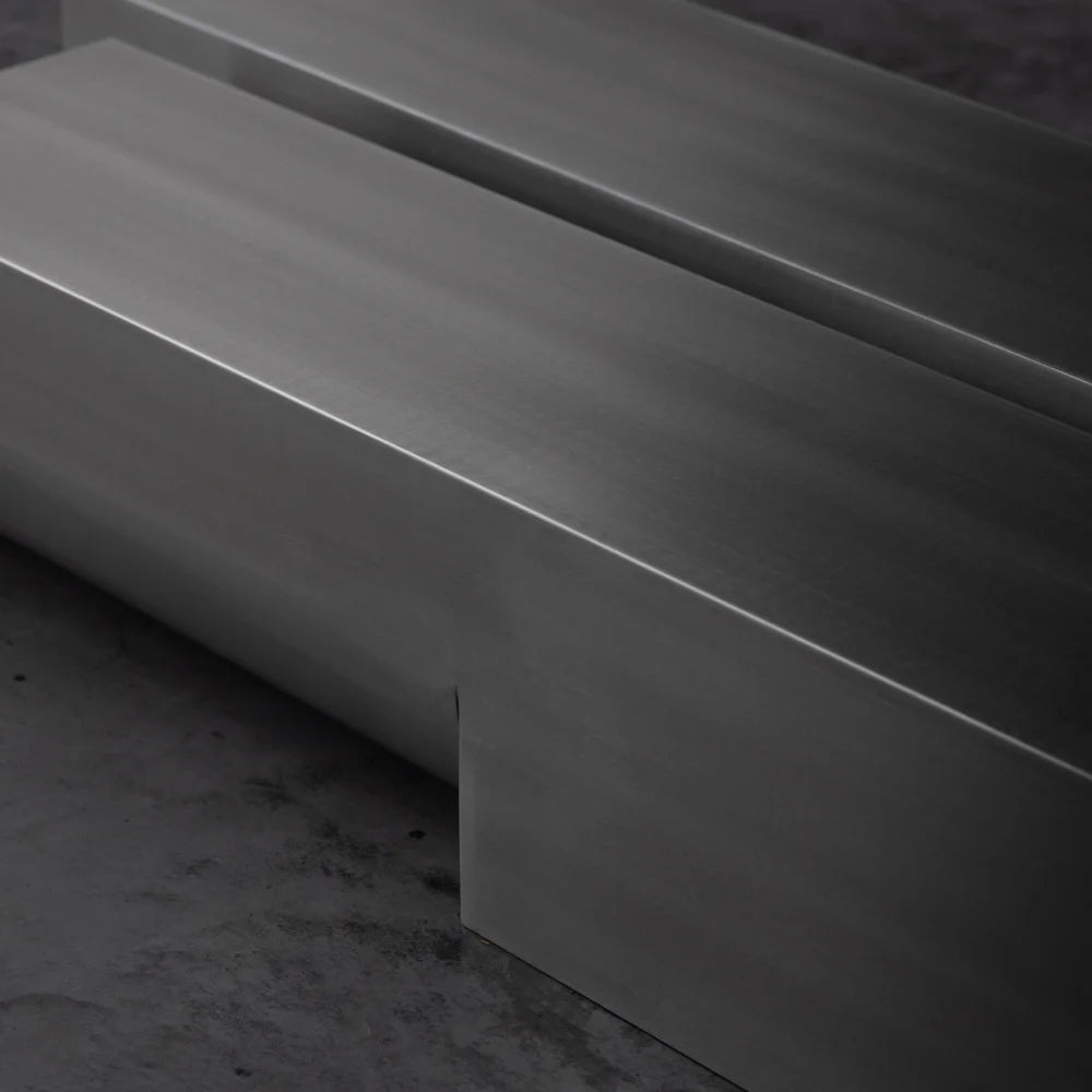 A monolithic coffee table crafted from brushed stainless steel, defined by a continuous volume with softened edges. Its surface reflects light with restraint, allowing material and mass to shape a calm, grounded presence.