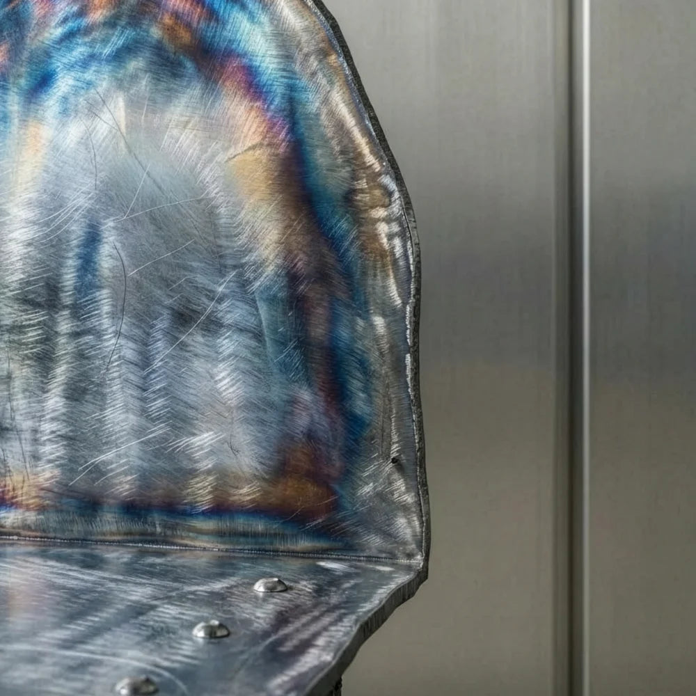 Ustio Chair explores fire as a process of transformation. Cut and folded from a single sheet of scorched steel, the form preserves traces of heat, engaging with a mineral base where tension, material, and void converge.